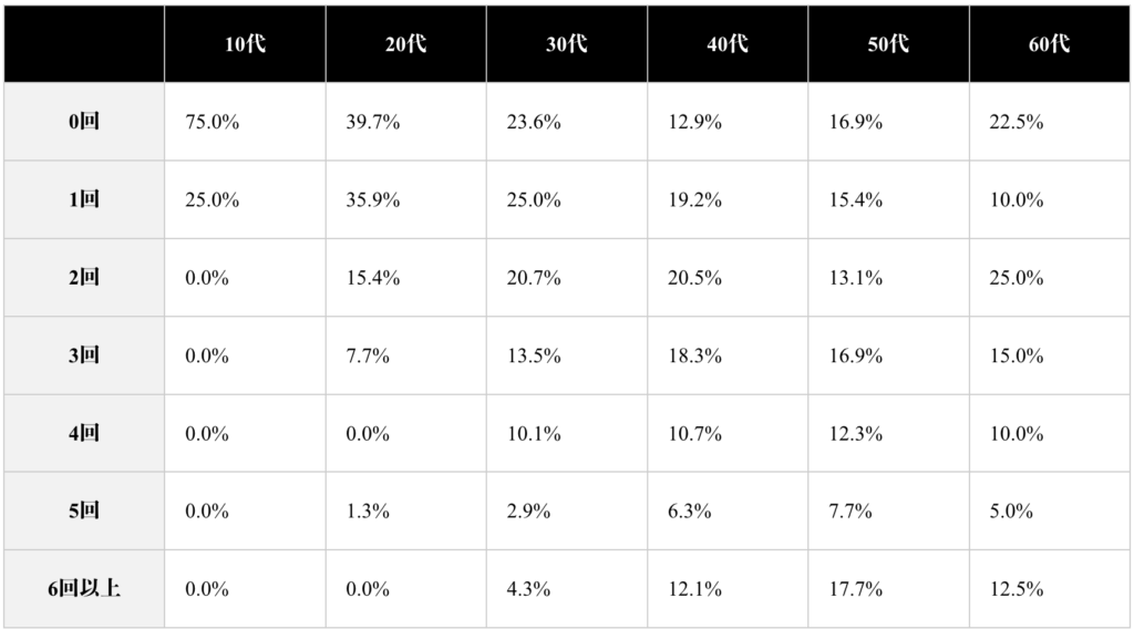年代別の転職回数を見てみると、20代で3回以上転職している人が7.7%であるのに対して、30代では13.5%と約5%増えています。